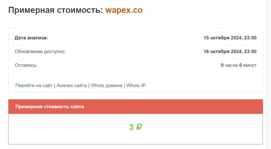 Специализированный сервис оценил старания создателей сайта wapex.co и это уже говорит о многом. На этом фоне байки об «успешном успехе» выглядят комично. Уже одного этого достаточно, чтобы сделать правильные выводы и навсегда забыть об этой шараге.