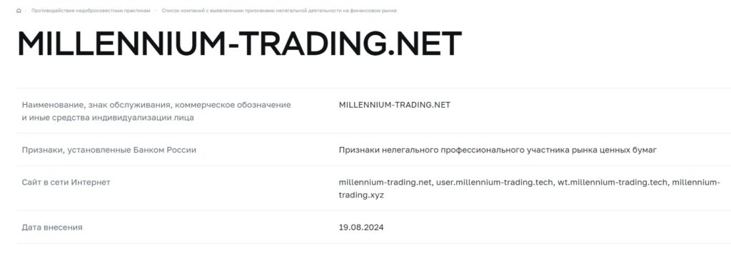 Ранее жулики использовали домен millennium-trading.net, попали в черный список российского Центробанка и были вынуждены переехать на другой адрес.