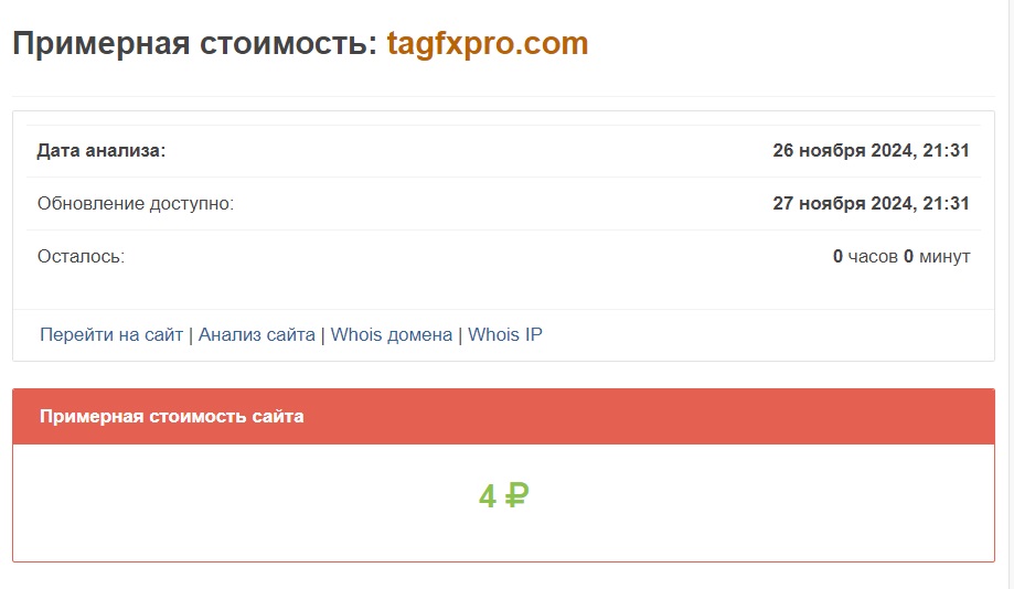 Вполне закономерно специализированный сервис оценил старания разработчиков tagfxpro.com в полновесные четыре рубля! Очевидно, что скам-проект рассчитан исключительно на доверчивых простофиль. Ни один трейдер, имеющий даже ничтожный опыт торговли, не поведется на подобное убожество.