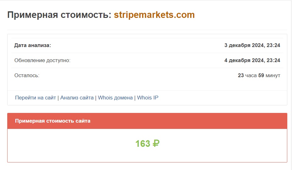Специализированный сервис оценил стоимость stripemarkets.com всего-то в полтора доллара США! Шарлатаны разводят народ на низкосортной пустышке, созданной по образу и подобию «успешных» финансовых лохотронов.