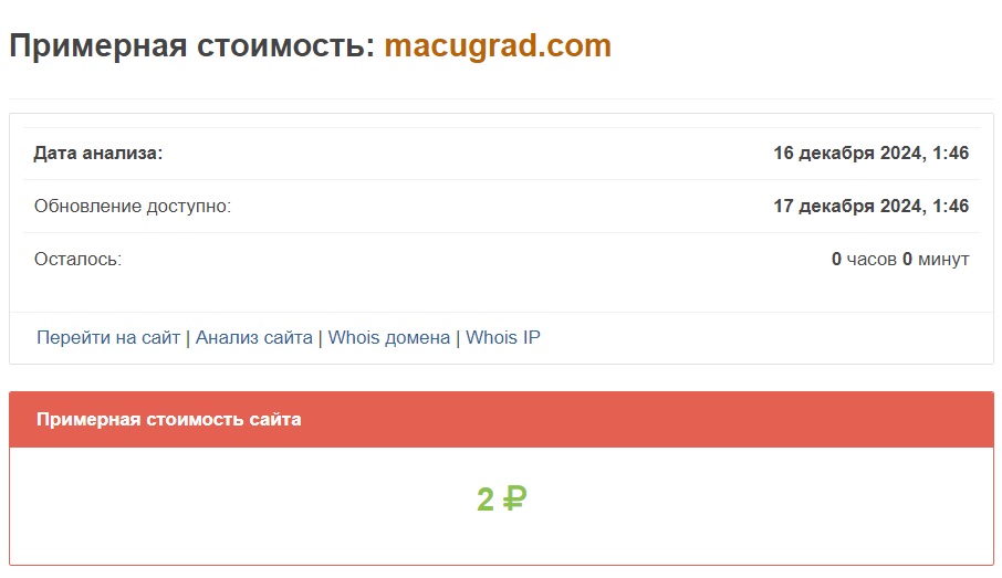 Специализированный сервис оценивает усилия разработчиков macugrad.com в два рубля. Только очень доверчивый человек может поверить, что за таким сайтом стоит легально действующая финансовая компания. Уже этого достаточно, чтобы сделать правильные выводы и навсегда забыть про эту анонимную организацию. Мошенники прекрасно понимают, что срок жизни таких схем крайне короток, и вскоре от сайта придется избавляться. Поэтому они не видят смысла вкладываться в продвижение своих мошеннических проектов.