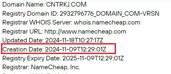 Доменное имя cntrkj.com было зарегистрировано 9 ноября 2024 года, сайт лохоброкера был запущен еще позже — несколько дней назад. Все росказни проходимцев об «успешном успехе» — это банальное вранье финансовых аферистов.
