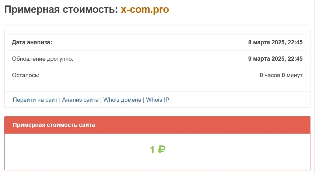 Специализированный сервис оценил старания разработчиков x-com.pro в один (!!!) рубль и все вопросы относительно уровня этой скам-конторы отпадают сами собой. Уже одного этого достаточно, чтобы сделать правильные выводы.