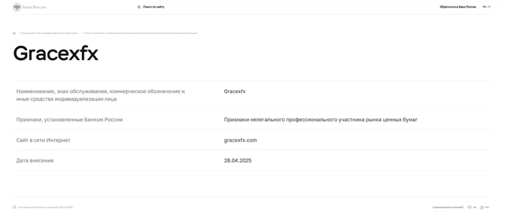 На официальном сайте ЦБР 28 апреля текущего года было размещено заявление о мошеннической деятельности лохоброкера GraceX. По мнению российского мегарегулятора лохотрон работает незаконно без соответствующих лицензий осуществляет деятельность на территории страны. 9 мая 2025 года сайт gracexfx.com был заблокирован в РФ. Для тех, кто под влиянием рекламы собирается открыть счет в этой конторе стоит хорошо подумать, чье мнение авторитетней: Центробанка РФ или проплаченных писак на различных мутных сайтах. Ответ лежит на поверности.