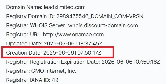 Также стоит обратить на дату регистрацию домена leadxlimited.com. Он был создан всего несколько недель назад — 6 июня текущего года. Перед нами очередной свежесобранный лохотрон, который находится в активном поиске наивных и богатых буратин.