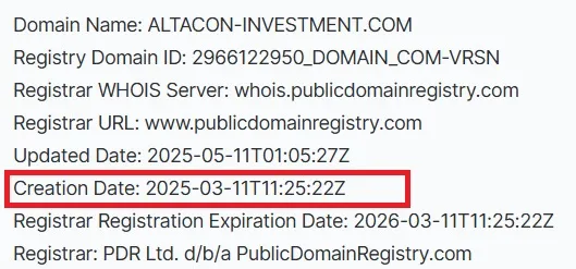 Доменное имя altacon-investment.com было зарегистрировано 11 марта текущего года, реальный стаж работы этой лоховозки всего несколько недель.