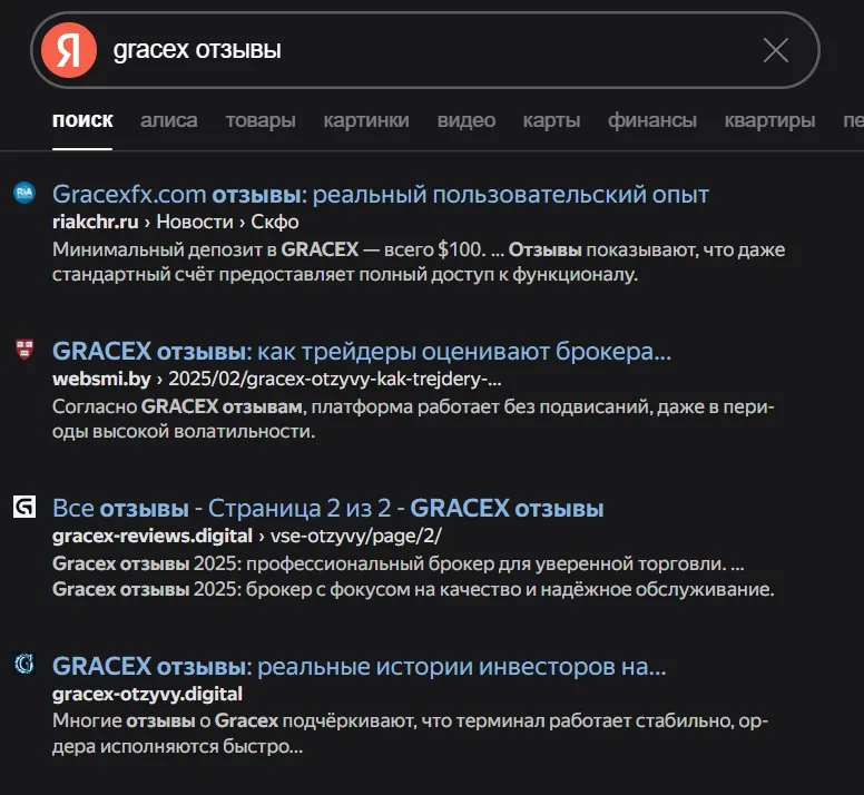 Кроме того, стоит обратить внимание на методы продвижения, используемые GraceX. Мошеннические платформы часто прибегают к недобросовестным методам, таким как поддельные отзывы, фальшивые рейтинги и отзывы от «экспертов». Наши аферисты не исключение. Поисковая выдача забита десятками хвалебных публикаций на различных мусорных сайтах, которые вообще не имеют отношения к финансовой тематике. Если вы замечаете, что платформа слишком активно рекламирует свои услуги и использует сомнительные методы продвижения, это серьезный повод задуматься о ее надежности.