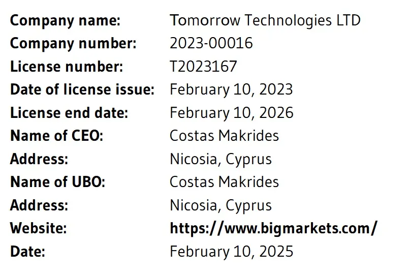 Данный веб-сайт (www.bigmarkets.com) управляется компанией Тоmоrrоw Technologies Ltd, зарегистрированной в Сент-Люсии, уполномоченной и регулируемой Управлением международных услуг Мвали с номером лицензии T2023167. Компания Тоmоrrоw Technologies Ltd зарегистрирована по адресу: Ground floor, The Sotheby Building, Rodney Village, Rodney Bay, Gros-Islet, Saint Lucia