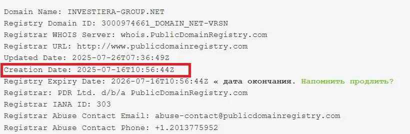 Также стоить обратить внимание на дату регистрации домена investiera-group.net — 16 июля текущего года. реальный стаж работы мошеннического сайта всего несколько недель. По факту мы имеем дело с недавно созданным лохотроном, деятельность которого никем не регулируется и не контролируется, который находится в активном поиске богатых и наивных буратин.