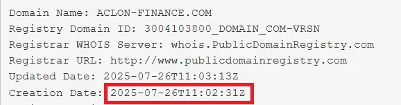 Первым делом стоит обратить внимание на дату регистрации домена официального сайта aclon-finance.com. Он был создан 26 июля текущего года. Сайт лохоброкера был запущен еще позже. Реальный стаж работы этой лоховозки от силы пара месяцев. Это никак не бьется с хвастливыми сказками об «успешном успехе» и годах успешной работы. Это первый тревожный звоночек, на который стоит обратить внимание.
