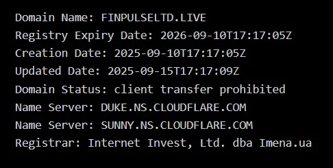 Еще один важный момент: домен finpulseltd.live был зарегистрирован 10 сентября 2025 года. Реальный стаж работы этой лоховозки всего пара недель, что никак не бьется с заявлениями на сайте о восьми годах успешной работы. Это еще один явный признак того, что мы имеем дело с лохотроном.