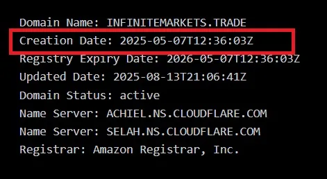 Дата регистрации домена infinitemarkets.trade — еще один важный момент, на который надо обратить внимание. Домен был создан 7 мая 2025 года, всего несколько месяцев назад. По факту перед нами недавно созданный анонимный лохотрон, который находится в активном поиске наивных и богатых буратин.