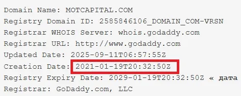 Доменное имя motcapital.com было создано в 2021 году, но это не говорит о длительном стаже работы компании.