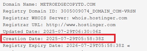 Простая проверка показывает, что домен metroedgecopytd.com был создан 29 июля текущего года и заявление о почти пятнадцатилетнем стаже — это банальное вранье финансовых аферистов.