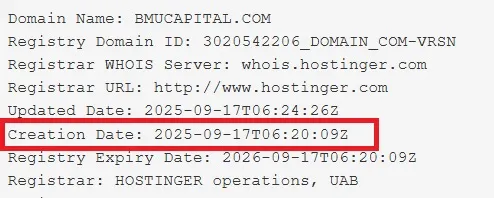 Между тем, доменное имя bmucapital.com было зарегистрировано всего две недели назад — 17 сентября текущего года. Версия о двенадцати годах успешной работы рассыпается на глазах. Это является первым признаком того, что перед нами мошенническая организация.