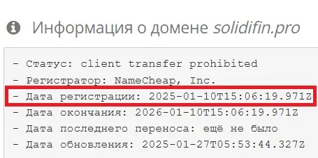 Также стоит обратить внимание на дату регистрации домена solidifin.pro — 10 января текущего года. Сайт лохоброкера по данному адресу был запущен еще позже. Реальный стаж работы этой лоховозки от силы два-три месяца. Это никак не вяжется с заявлениями аферистов о лидирующих позициях в отрасли. Перед нами очередной недавно созданный лохотрон, который находится в активном поиске наивных буратин.