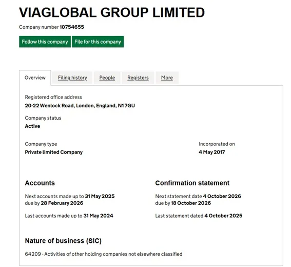Стоит отметить, что британская компания VIAGLOBAL GROUP LIMITED действительно существует, но к мошенническому сайту viaglobal.pro она не имеет никакого отношения. Проходимцы просто взяли в открытом доступе данные легально действующей организации и пытаются прикрыть ими свои махинации. Это довольно распространенная практика в среде финансовых мошенников. По факту мы имеем дело с неизвестными аферистами, деятельность которых никем не регулируется и не контролируется.