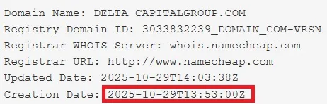 Доменное имя delta-capitalgroup.com было создано всего две недели назад — 29 октября 2025 года. Реальный стаж работы этой лоховозки всего пара недель. Перед нами очередной свежесобранный лохотрон, который совсем недавно начал свою деятельность и находится в активном поиске клиентов.