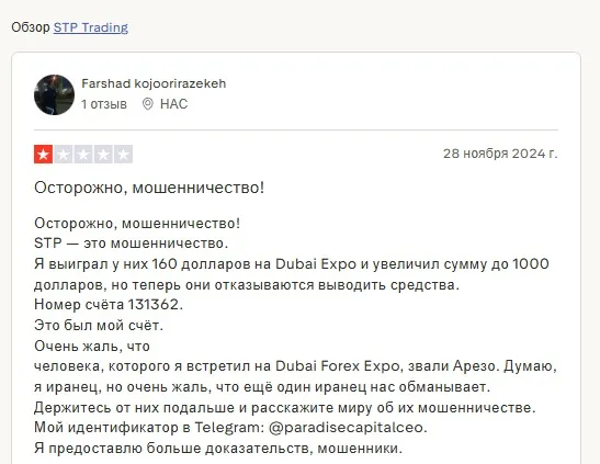Трейдеры, которые уже имели дело с STP Trading, часто жалуются на проблемы с выводом средств, плохое качество обслуживания и внезапные изменения в условиях торговли. Все это указывает на то, что компания может быть липовым брокером, использующим деньги клиентов в своих целях.