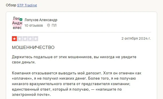 Отзывы клиентов — один из самых достоверных источников информации о работе брокера. В случае с STP Trading мнения трейдеров весьма неоднозначны, и многие из них настоятельно рекомендуют избегать сотрудничества с этой компанией.