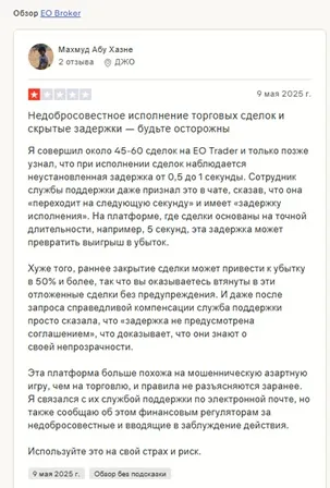 Еще один важный признак — это отсутствие прозрачности в финансовых операциях. Многие пользователи отмечают, что после внесения депозита они сталкиваются с трудностями при попытке вывести свои средства. EO Broker затягивает процесс, может требовать дополнительные документы или вовсе игнорировать запросы клиентов. Все это указывает на явное намерение компании удерживать средства клиентов любыми способами.