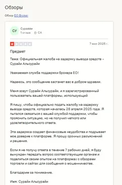 Отзывы пользователей — это один из наиболее достоверных источников информации о деятельности брокера. В случае с EO Broker, множество негативных отзывов и жалоб пользователей свидетельствуют о том, что эта платформа не заслуживает доверия. Многие трейдеры жалуются на проблемы с выводом средств, плохую работу службы поддержки и некорректное поведение менеджеров компании.