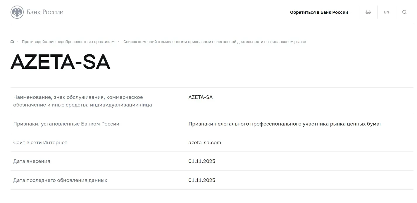 Одним из главных признаков лохотрона является отсутствие прозрачности и конкретики в предоставляемой информации. В случае с AZETA SA, мы видим, что компания не предоставляет четких данных о своем юридическом статусе, лицензиях и регулирующих органах. Аферисты утверждают, что зарегистрированы в Швейцарии и даже приводят ссылку на реестр:
